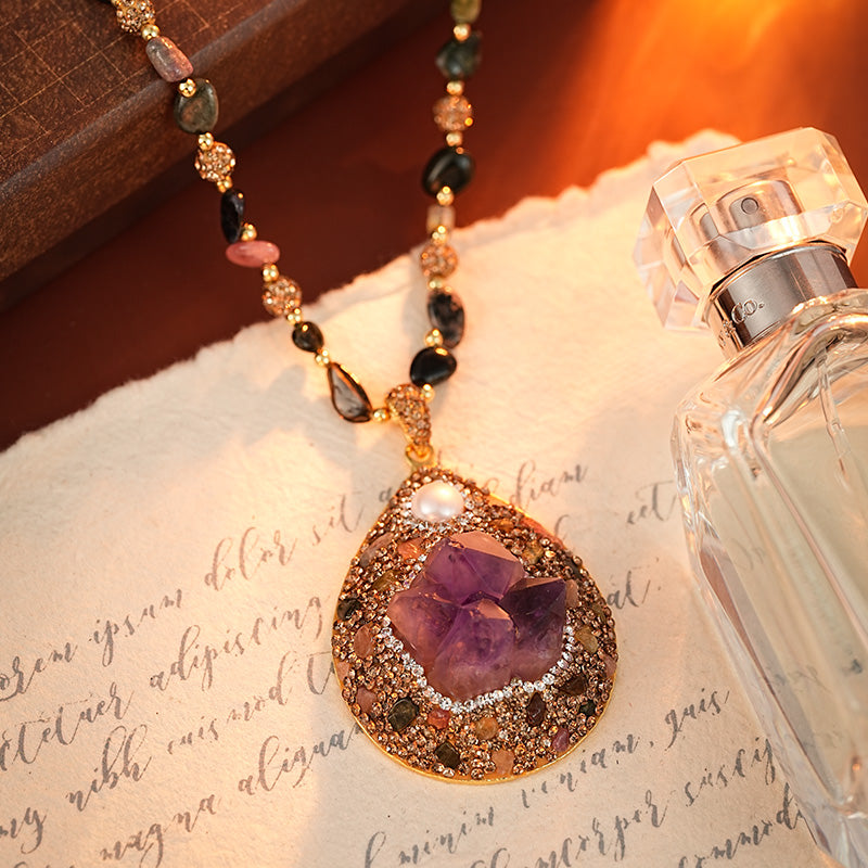 Achieve a classic and elegant look with our Amethyst Pearl Tourmaline Necklace. Made with beautiful amethyst, lustrous pearls, and stunning tourmaline, this necklace will add a touch of sophistication to any outfit. Perfect for special occasions or as a statement piece for everyday wear.