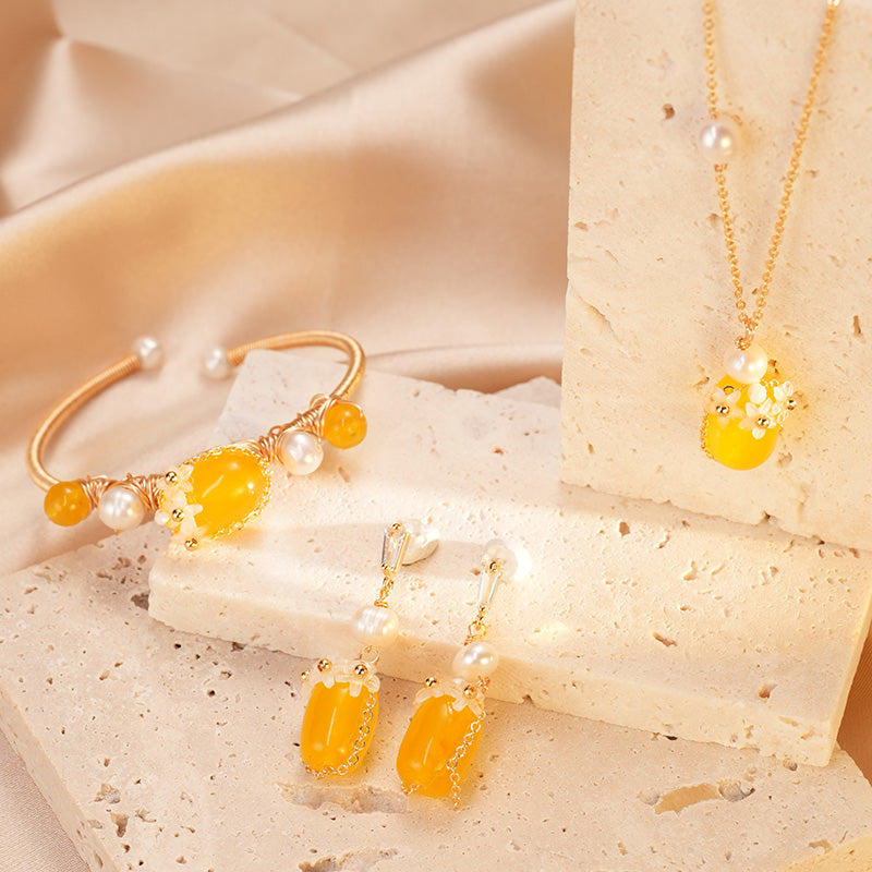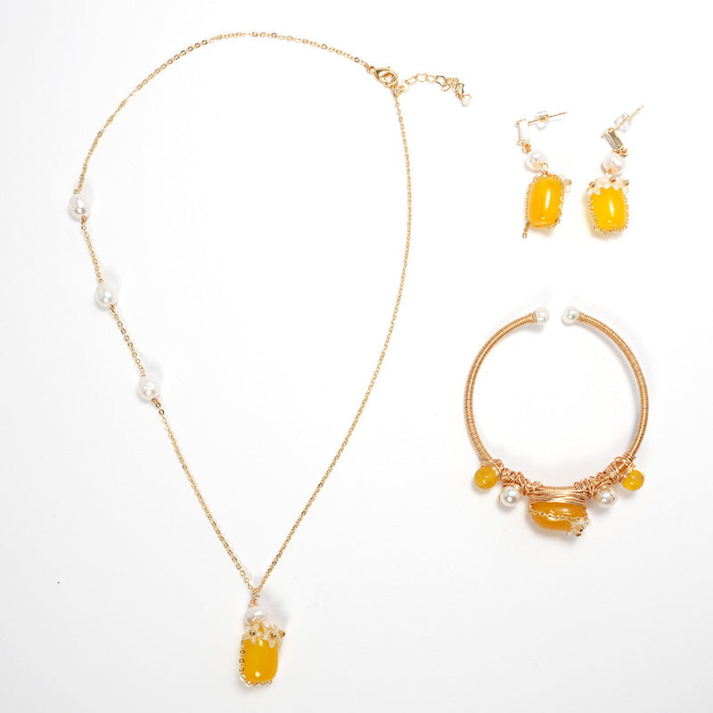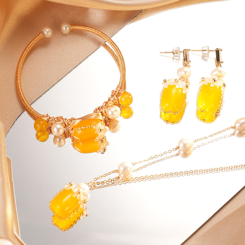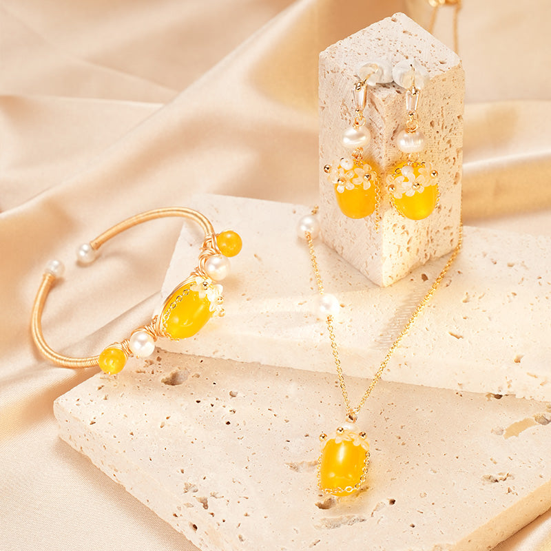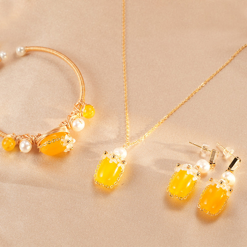 The citrine necklace, bracelet and earrings suit is coming. The perfect combination of necklace, bracelet and earrings shows elegance and luxury. Shining in time, it becomes your charm code. Let this brilliance decorate your beautiful life.